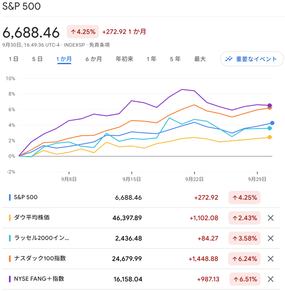蓋を開けてみれば9月も絶好調だった米国株。「9月は1年で最も弱い」というアノマリーを無視して、一方的な右肩上がりを見せてくれましたが、やはりFOMCによる利下げが大きかったと思います。