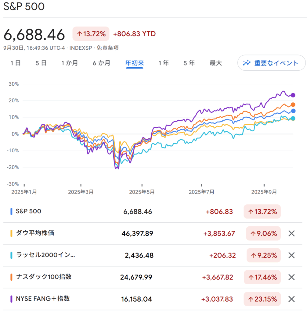 各指数の年初来チャート。引き続き全てプラスです。強い。