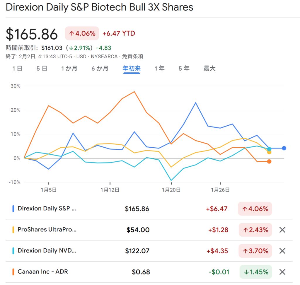こちらは投信以外のETF群。上から順番にLABU、TQQQ、NVDU、そしてCAN(カナン)となっています。