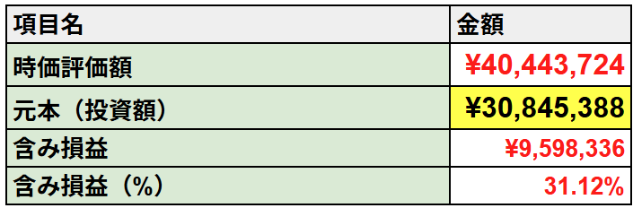 2026年1月末時点の評価額はこちら。元本がやっと3,000万円を超えましたが、今月は事業売り上げが好調で、その分の入金が増えて元本が増えました。