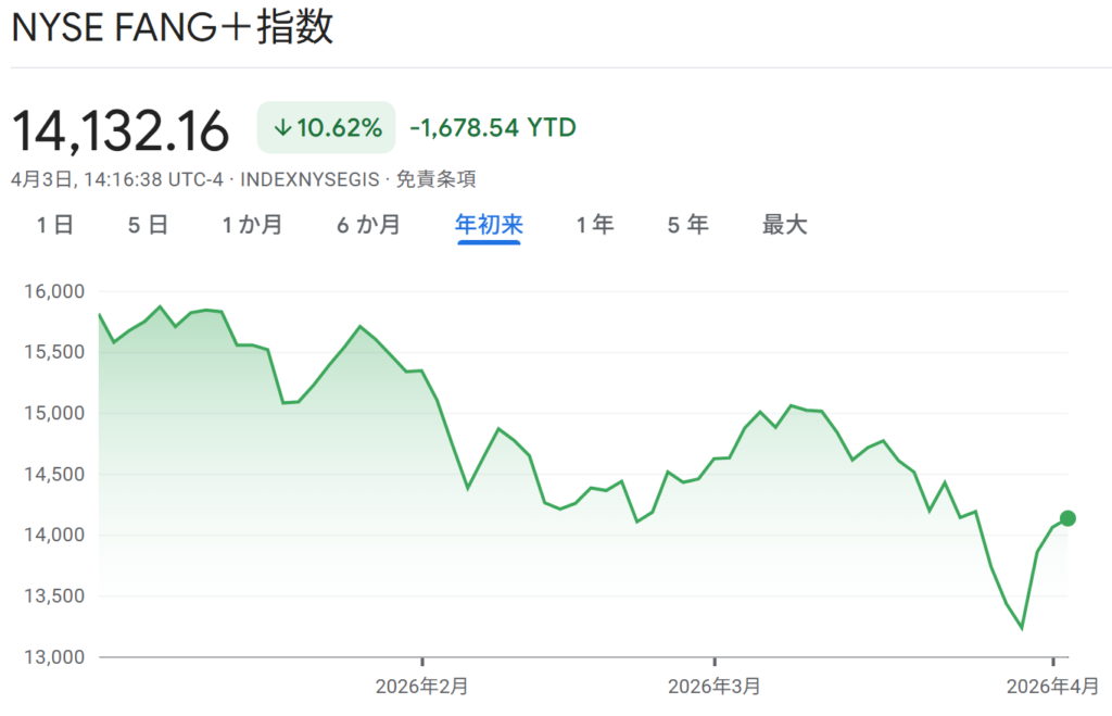 3月末から4月頭にかけて少し戻しましたが、年初来ではまだ-10%超え。