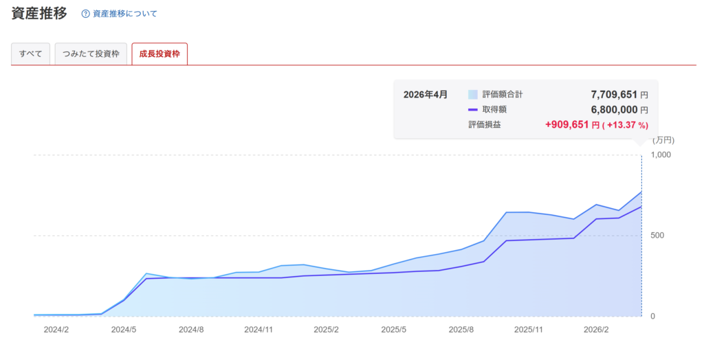 上記はつみたて投資枠と成長投資枠のそれぞれのリターン(2024年1月~)です。合計すると約146万円の含み益がでています。十分なリターン!